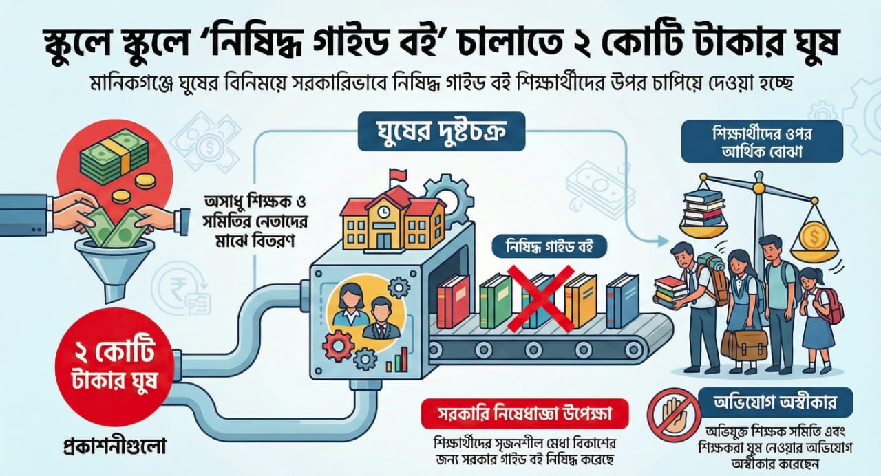 শিক্ষার্থীদের সৃজনশীল মেধা বিকাশে সরকার গাইড বই নিষিদ্ধ করেছে। তবু, মানিকগঞ্জের অধিকাংশ স্কুলে শিক্ষার্থীদের মাঝে সহায়ক বইয়ের নামে ‘নিষিদ্ধ গাইড’ বই বিক্রির ব্যাপক আয়োজন চলছে। অভিযোগ উঠেছে, বিভিন্ন প্রকাশনীর কাছ থেকে মোটা অংকের টাকা ঘুষ নিয়ে এসব বই কিনতে উৎসাহ দিচ্ছেন অসাধু শিক্ষকরা।