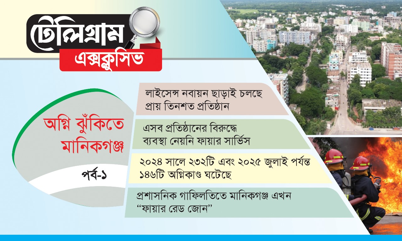 মানিকগঞ্জে প্রতিবছর পাল্লা দিয়ে বাড়ছে ভবন নির্মাণ ও ব্যবসা প্রতিষ্ঠান। তবে এর সঙ্গে বাড়ছে অগ্নি নিরাপত্তা ঝুঁকিও। জেলার সাতটি উপজেলার প্রায় ৩০০টি ব্যবসা প্রতিষ্ঠান ফায়ার সার্ভিসের সনদ নবায়ন না করেই কার্যক্রম পরিচালনা করছে। অনেক প্রতিষ্ঠান একেবারেই কোনো ফায়ার সনদ ছাড়াই পরিচালিত হচ্ছে। এতে জেলার গুরুত্বপূর্ণ অধিকাংশ ব্যবসা প্রতিষ্ঠানের কর্মপরিবেশ রয়েছে মারাত্মক অগ্নি ঝুঁকিতে।