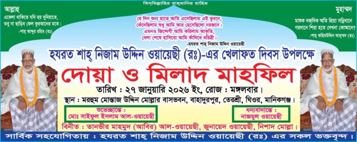ঘিওরে হযরত শাহ্ নিজাম উদ্দিন উয়ায়েছির খেলাফত দিবস উপলক্ষে দোয়া ও মিলাদ মাহফিল