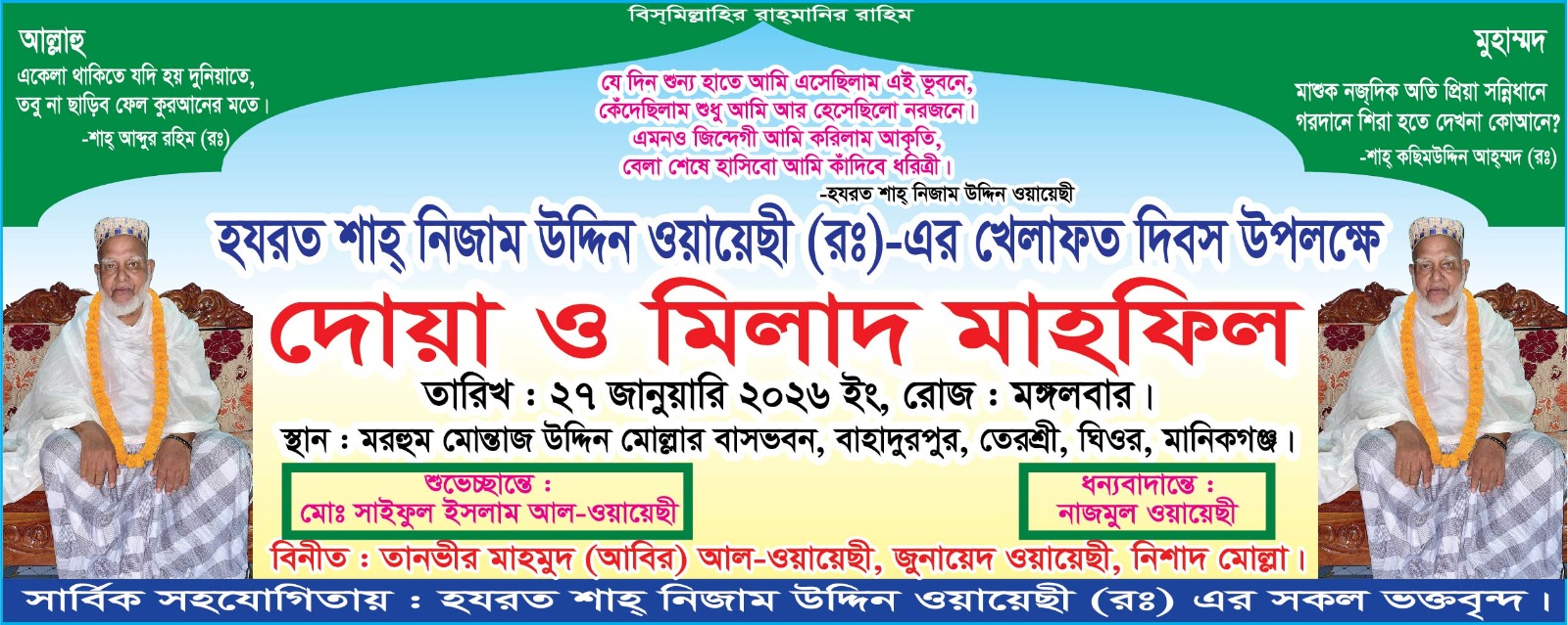 হযরত শাহ্ নিজাম উদ্দিন উয়ায়েছি ( রঃ) ভক্ত বৃন্দের সার্বিক সহযোগিতায় মোঃ সাইফুল ইসলাম আল উয়ায়েছির শুভেচ্ছান্তে, নাজমুল ইসলাম উয়ায়েছির ধন্যবাদান্তে, তানভীর মাহমুদ ( আবির) আল উয়ায়েছি, জুনায়েদ উয়ায়েছি ও নিশাদ মোল্লার তত্ত্বাবধানে অনুষ্ঠিত মিলাদ ও দোয়া মাহফিল পরিচালনা করেন, শাহ্ হোসাইন মোহাম্মদ রফিকুল হক উয়ায়েছি ও মতিয়ার রহমান উয়ায়েছি।