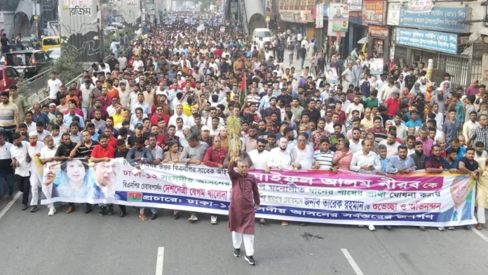 ঢাকা মহানগর উত্তর বিএনপির যুগ্ম আহ্বায়ক হাজী ইউসুফ হোসেনের সভাপতিত্বে এবং সাবেক ছাত্রনেতা মনিরুজ্জামান মনির ও সালামত খান সজিবের যৌথ সঞ্চালনায় সংক্ষিপ্ত সমাবেশ অনুষ্ঠিত হয়। পরে গণমিছিলটি মানিক মিয়া অ্যাভিনিউ থেকে শুরু হয়ে ফার্মগেট, কারওয়ান বাজার, বাংলামোটর, মগবাজার হয়ে সাতরাস্তায় গিয়ে শেষ হয়।