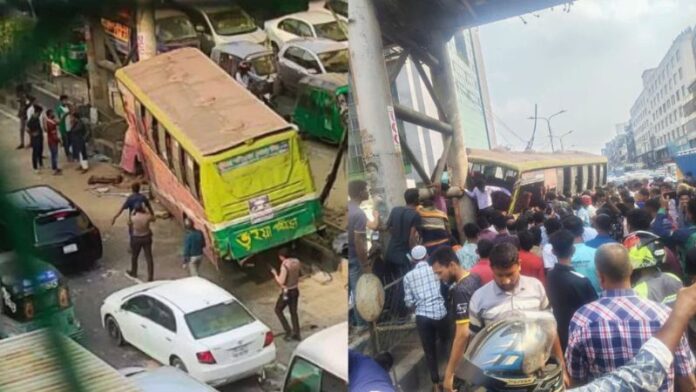 পুলিশ ও স্থানীয় সূত্রে জানা যায়, মহাখালী থেকে গাজীপুরগামী ‘ভুঁইয়া পরিবহন’-এর একটি বাসে তৃতীয় লিঙ্গের কয়েকজন ব্যক্তি উঠতে চাইলে চালক ও হেলপার বাধা দেয়। এ নিয়ে হাতাহাতির একপর্যায়ে বাসটি নিয়ন্ত্রণ হারিয়ে সড়কের আইল্যান্ডে উঠে গিয়ে ফুটওভার ব্রিজে সজোরে ধাক্কা দেয়। এ সময় সড়কে কাজ করা দুই শ্রমিক বাসের আঘাতে ঘটনাস্থলেই নিহত হন।