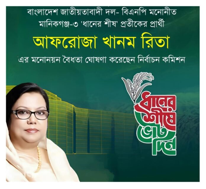 বাংলাদেশ জাতীয়তাবাদী দল-বিএনপি মনোনীত মানিকগঞ্জ-৩ আসনের ‘ধানের শীষ’ প্রতীকের প্রার্থী আফরোজা খানম রিতা এর মনোনয়ন বৈধতা ঘোষণা করেছেন নির্বাচন কমিশন