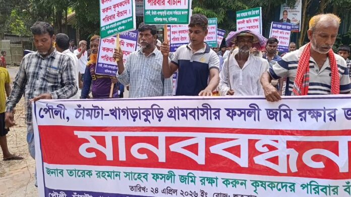 মানববন্ধনে অংশ নেওয়া কৃষকদের অভিযোগ, একটি প্রভাবশালী চক্র দীর্ঘদিন ধরে পৌলী ,চামটা ও খাগড়াছড়ি এলাকায় ফসলি জমি থেকে অবাধে মাটি কেটে নিয়ে যাচ্ছে। এতে আবাদি জমি গভীর গর্তে পরিণত হচ্ছে এবং আশপাশের জমিও ভেঙে পড়ার ঝুঁকিতে রয়েছে। ফলে কৃষি উৎপাদন মারাত্মকভাবে হুমকির মুখে পড়েছে।