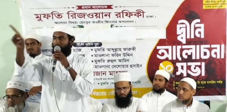 প্রধান আলোচক মুফতি রিজওয়ান রফিকী তাঁর বক্তব্যে হেজবুত তওহীদের প্রচারিত বিভিন্ন বিভ্রান্তিকর মতবাদ সম্পর্কে বিস্তারিত আলোচনা করেন এবং ইসলামের মূল ধারা থেকে বিচ্যুতি রোধে মুসলিম জনসমাজকে সতর্ক থাকার আহ্বান জানান। তিনি বলেন, “ইসলামের নামে বিভ্রান্তি ছড়ানো যেকোনো অপচেষ্টা রুখতে আলেম সমাজকে ঐক্যবদ্ধ থাকতে হবে।”