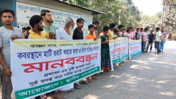 স্থানীয়রা জানান, কাঞ্চননগর, খোলাসুর, পানিশাইল ও ভূমদক্ষিণ এই চার গ্রামের মানুষের জন্য কবরস্থানটি ব্যবহার করা হয়। সম্প্রতি কবরস্থান উন্নয়নের জন্য স্থানীয় প্রশাসনের অনুমতি নিয়ে মাটি ভরাটের উদ্যোগ নেয় কবরস্থান কমিটি।