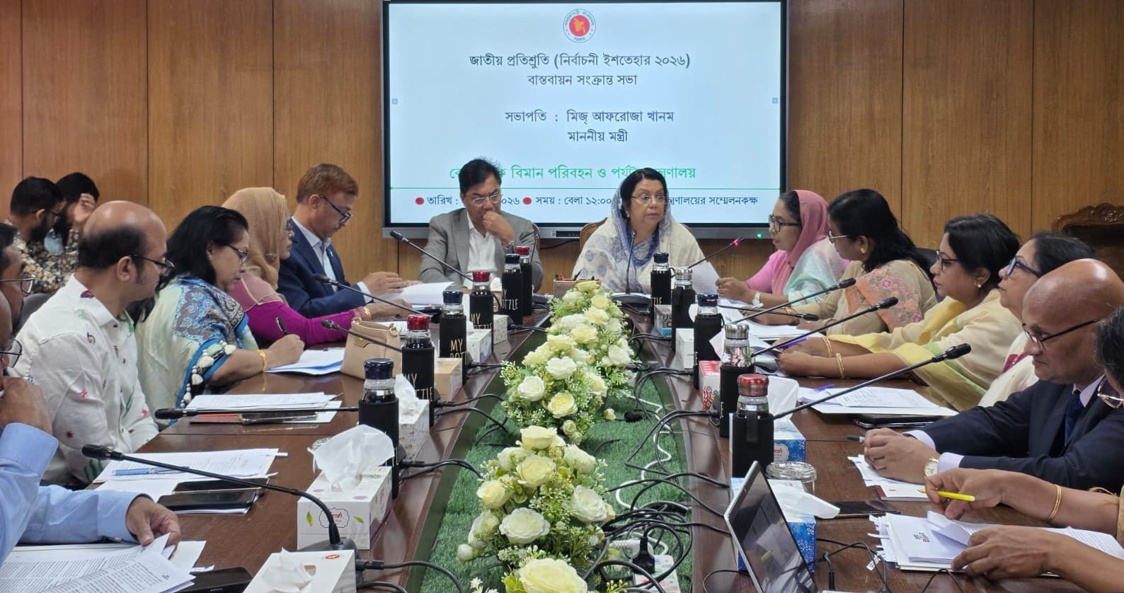 বেসামরিক বিমান পরিবহন ও পর্যটন খাতে জাতীয় প্রতিশ্রুতি (নির্বাচনী ইশতেহার ২০২৬) বাস্তবায়ন নিয়ে এক সভা অনুষ্ঠিত হয়েছে। মঙ্গলবার দুপুর ১২টায় মন্ত্রণালয়ের সম্মেলন কক্ষে আয়োজিত এ সভায় সভাপতিত্ব করেন বিমানমন্ত্রী আফরোজা খানম (রিতা)।