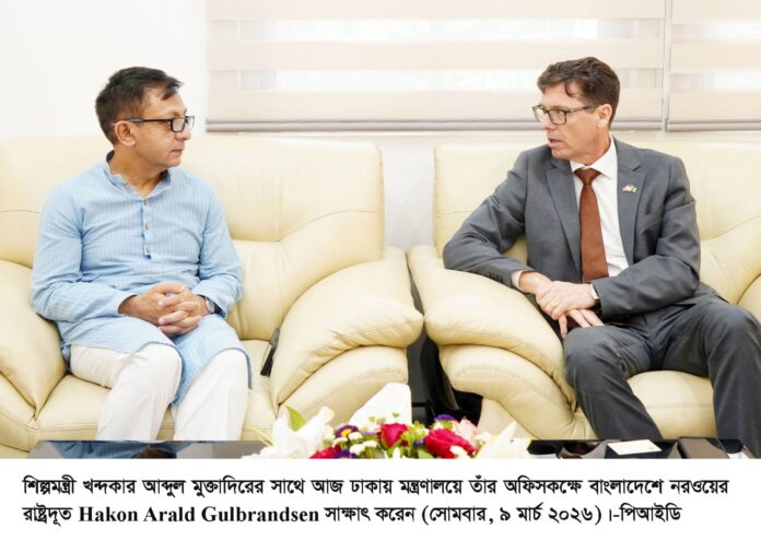 শিল্পমন্ত্রী খন্দকার আব্দুল মুক্তাদির- এর সাথে বাংলাদেশে নিযুক্ত নরওয়ের রাষ্ট্রদূত হাকন আরল্ড গুলব্রান্ডসেন ( Håkon Arald Gulbrandsen ) আজ শিল্প মন্ত্রণালয়ে তার দপ্তরে সৌজন্য সাক্ষাৎ করেন। সাক্ষাৎকালে তাঁরা বাংলাদেশ ও নরওয়ের মধ্যকার বিদ্যমান বন্ধুত্বপূর্ণ সম্পর্ক, বাণিজ্য ও শিল্প খাতে সহযোগিতা বৃদ্ধির বিভিন্ন বিষয় নিয়ে আলোচনা করেন।