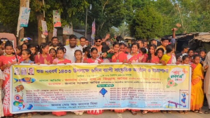 গালে-হাতে আলপনা, মাথায় ফুলের টায়রা ও সাজসজ্জায় রঙিন করে তোলেন তরুণীরা। উৎসব-উদ্দীপনায় বাংলা নতুন বছরকে বরণ করে নেওয়া হচ্ছে। নতুন বছরকে ঘিরে এলাকাজুড়ে উচ্ছ্বাসের জোয়ার বইছে।