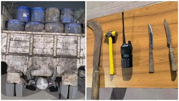 নারায়ণগঞ্জের রূপগঞ্জে তেলের ড্রামবোঝাই একটি ট্রাকে ডাকাতির চেষ্টাকালে দেশীয় অস্ত্রসহ দুই ডাকাতকে গ্রেপ্তার করেছে পুলিশ। এ সময় লুণ্ঠিত মালামালসহ ট্রাকটি উদ্ধার এবং ডাকাতির কাজে ব্যবহৃত একটি হাইয়েস মাইক্রোবাস জব্দ করা হয়েছে।