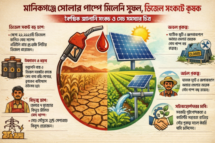 মধ্যপ্রাচ্যের চলমান যুদ্ধের প্রভাবে আন্তর্জাতিক জ্বালানি বাজারে অস্থিরতা তৈরি হওয়ায় দেশের কৃষি খাতে ডিজেল সরবরাহে প্রভাব পড়েছে। মানিকগঞ্জের অনেক কৃষকই এখন সেচের জন্য ডিজেল পেতে হিমশিম খাচ্ছেন। অথচ, জ্বালানি সাশ্রয়ের বিকল্প হিসেবে নেওয়া জেলার সোলার ইরিগেশন প্রকল্পের অনেকগুলোই অচল হয়ে আছে। কোথাও যান্ত্রিক ত্রুটি, কোথাও আবার টেকনিশিয়ানের অভাবে বন্ধ রয়েছে পাম্প। প্রায় একযুগ আগে পরিবেশ বান্ধব এসব কোটি টাকার প্রকল্প শুরু হলেও সুফল মেলেনি বলে জানিয়েছেন চাষিরা। তথ্য বলছে, জেলায় প্রায় ৯ হাজার বিদুৎচালিত সেচ পাম্প রয়েছে। এসব পাম্পে প্রত্যেক বছর ৩৫ মেগাওয়াট বিদুৎ প্রয়োজন হয়। এছাড়াও ২১ হাজার ২২৩টি ডিজেল চালিত সেচ পাম্প রয়েছে। সেচ মৌসুমে এসব পাম্পে একদিনে প্রায় ৮৫ হাজার লিটার ডিজেল তেল প্রয়োজন। মধ্যপ্রাচ্যের চলমান যুদ্ধের প্রভাবে আন্তর্জাতিক জ্বালানি বাজারে অস্থিরতা তৈরি হওয়ায় দেশের কৃষি খাতে ডিজেল সরবরাহে প্রভাব পড়েছে। মানিকগঞ্জের অনেক কৃষকই এখন সেচের জন্য ডিজেল পেতে হিমশিম খাচ্ছেন। অথচ, জ্বালানি সাশ্রয়ের বিকল্প হিসেবে নেওয়া জেলার সোলার ইরিগেশন প্রকল্পের অনেকগুলোই অচল হয়ে আছে। কোথাও যান্ত্রিক ত্রুটি, কোথাও আবার টেকনিশিয়ানের অভাবে বন্ধ রয়েছে পাম্প। প্রায় একযুগ আগে পরিবেশ বান্ধব এসব কোটি টাকার প্রকল্প শুরু হলেও সুফল মেলেনি বলে জানিয়েছেন চাষিরা। তথ্য বলছে, জেলায় প্রায় ৯ হাজার বিদুৎচালিত সেচ পাম্প রয়েছে। এসব পাম্পে প্রত্যেক বছর ৩৫ মেগাওয়াট বিদুৎ প্রয়োজন হয়। এছাড়াও ২১ হাজার ২২৩টি ডিজেল চালিত সেচ পাম্প রয়েছে। সেচ মৌসুমে এসব পাম্পে একদিনে প্রায় ৮৫ হাজার লিটার ডিজেল তেল প্রয়োজন।